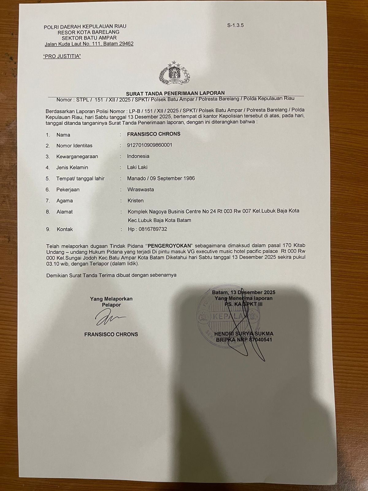 LP-B/151/XII/2025/SPKT/Polsek Batu Ampar/Polresta Barelang/Polda Kepulauan Riau.