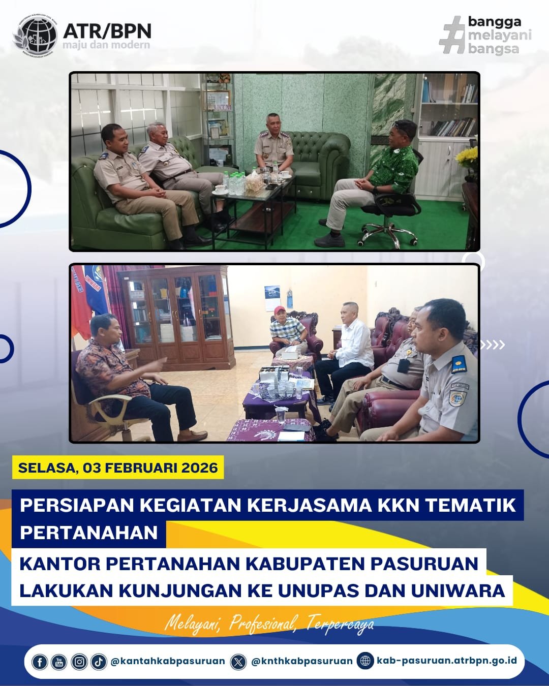 Kunjungan yang dipimpin langsung oleh Kepala Kantor Pertanahan Kabupaten Pasuruan beserta jajaran ini dilakukan dalam rangka persiapan kerja sama pelaksanaan Kuliah Kerja Nyata (KKN) Tematik Pertanahan. Program tersebut dirancang sebagai bentuk kolaborasi strategis untuk mendukung program pertanahan sekaligus meningkatkan literasi dan pemahaman masyarakat di bidang administrasi pertanahan.