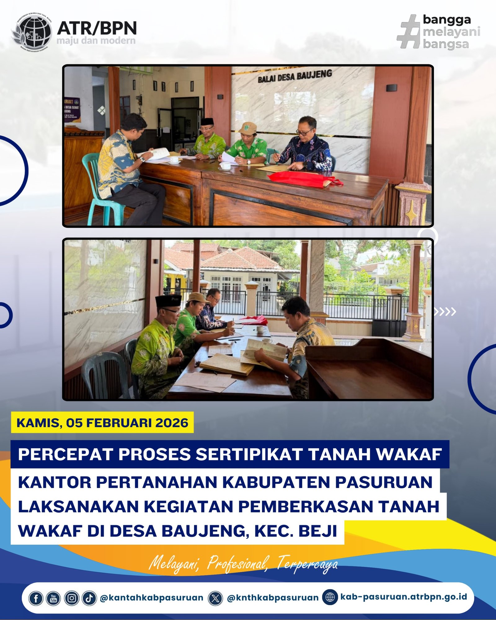 PASURUAN — Dalam upaya mempercepat proses penerbitan sertipikat tanah wakaf, Kantor Pertanahan Kabupaten Pasuruan melaksanakan kegiatan pemberkasan tanah wakaf di Desa Baujeng, Kecamatan Beji, Kabupaten Pasuruan, Kamis (5/2/2026).