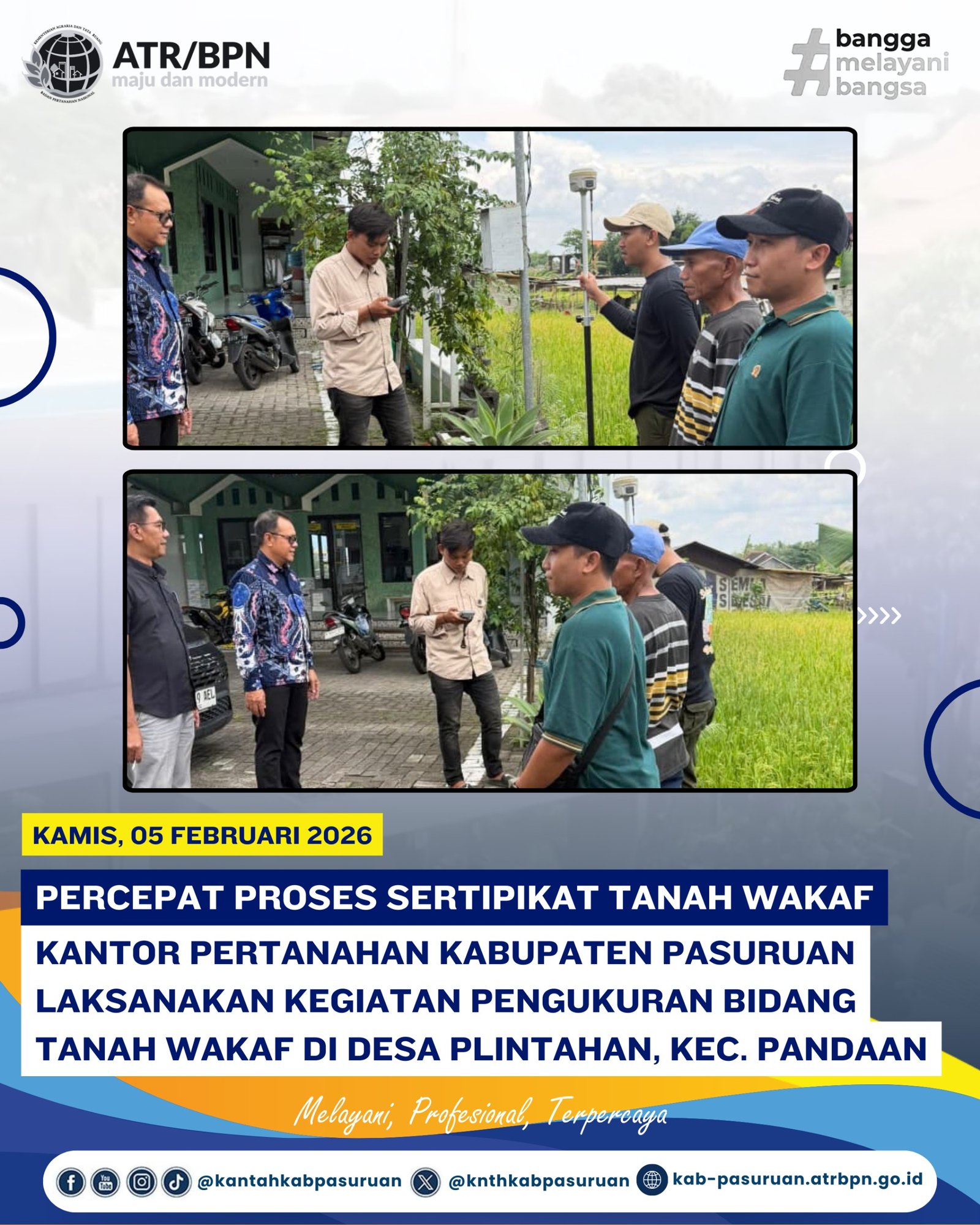 PASURUAN — Dalam upaya mempercepat proses sertipikasi tanah wakaf, Kantor Pertanahan Kabupaten Pasuruan melaksanakan kegiatan pengukuran bidang tanah wakaf yang berlokasi di Desa Plintahan, Kecamatan Pandaan, Kabupaten Pasuruan, Kamis (5/2/2026).