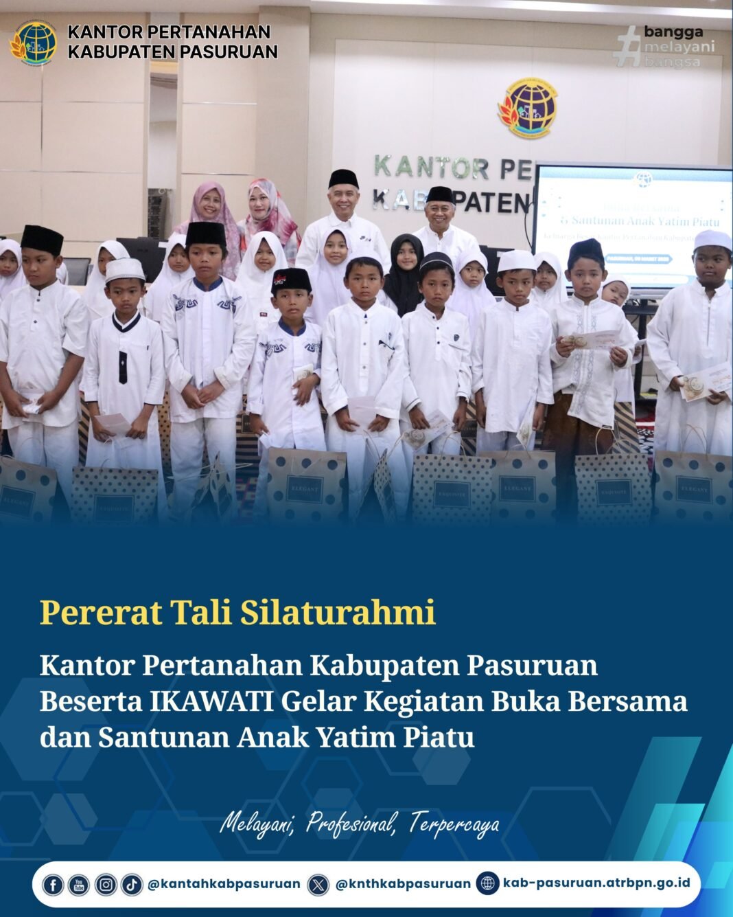 Kegiatan yang berlangsung dalam suasana penuh kehangatan dan kebersamaan ini dihadiri oleh seluruh keluarga besar Kantor Pertanahan Kabupaten Pasuruan beserta pengurus dan anggota IKAWATI. Momentum Ramadan dimanfaatkan sebagai ajang memperkuat rasa kekeluargaan serta mempererat hubungan antarpegawai di lingkungan kantor.