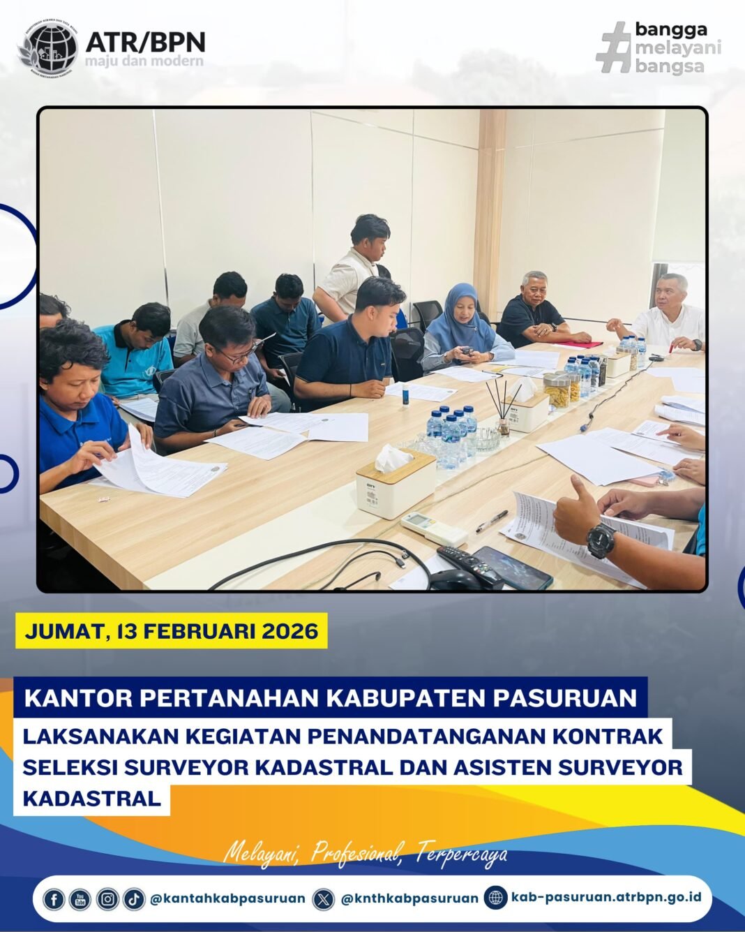 Pasuruan, fokustkp.com – Kantor Pertanahan Kabupaten Pasuruan resmi menandatangani kontrak kerja bagi Surveyor Kadastral dan Asisten Surveyor Kadastral yang dinyatakan lulus dalam proses seleksi pengadaan. Kegiatan ini digelar di Ruang Rapat Kepala Kantor Pertanahan Kabupaten Pasuruan, Jumat (13/2/2026).