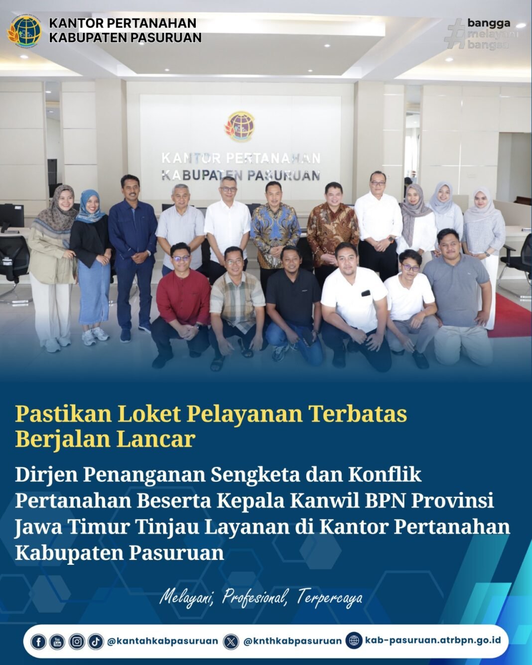 Pasuruan — Dalam rangka memastikan pelayanan pertanahan tetap berjalan optimal selama masa libur dan cuti bersama Hari Suci Nyepi serta Idulfitri 1447 Hijriah, Direktur Jenderal Penanganan Sengketa dan Konflik Pertanahan bersama Kepala Kantor Wilayah Badan Pertanahan Nasional (BPN) Provinsi Jawa Timur melakukan peninjauan ke Kantor Pertanahan Kabupaten Pasuruan, Selasa (24/3/2026).