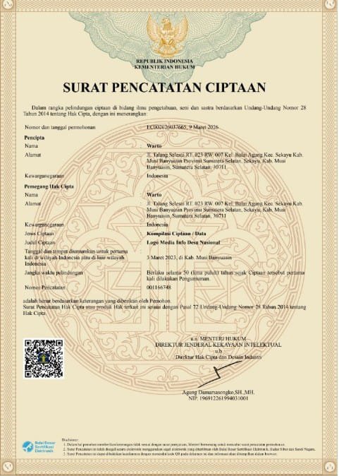 Sekayu – Kementerian Hukum Republik Indonesia melalui Direktorat Jenderal Kekayaan Intelektual secara resmi menerbitkan Surat Pencatatan Ciptaan kepada seorang kreator asal Sumatera Selatan, Warto. Surat tersebut menjadi bukti legal atas kepemilikan hak cipta terhadap karya berupa logo yang digunakan dalam media informasi desa berskala nasional.