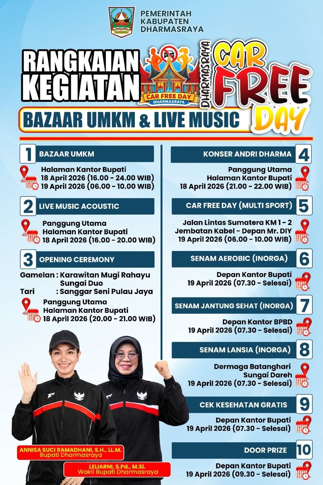 Kabupaten Dharmasraya – Pemerintah Kabupaten Dharmasraya akan menggelar rangkaian kegiatan Car Free Day (CFD) yang dipadukan dengan bazaar UMKM, hiburan, olahraga, pada 18–19 April 2026 di kawasan Kantor Bupati dan sekitarnya.