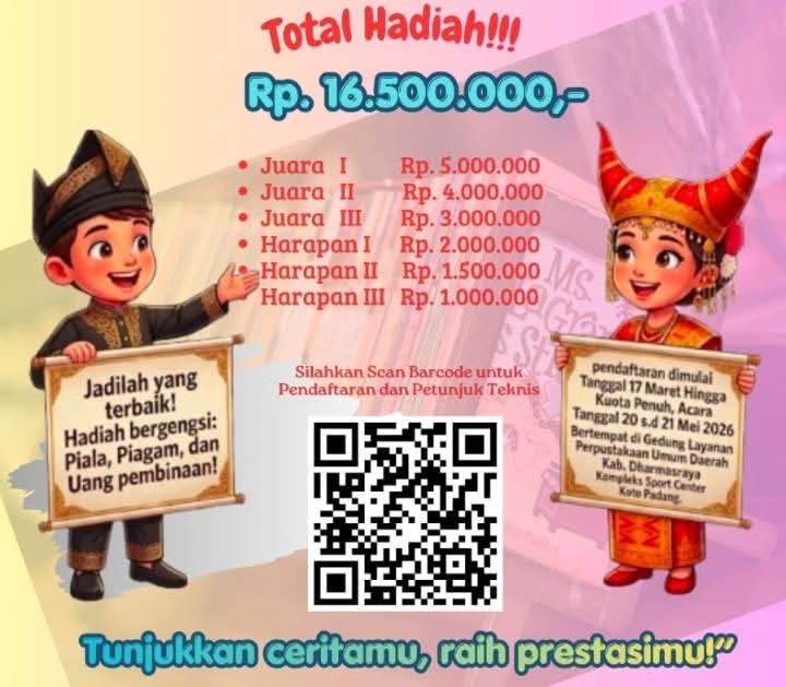 Dharmasraya — Pemerintah Kabupaten Dharmasraya melalui Dinas Perpustakaan dan Kearsipan akan menggelar Lomba Bertutur Tingkat SD/MI Tahun 2026 sebagai upaya memperkuat budaya literasi sekaligus membangun karakter generasi muda di daerah.