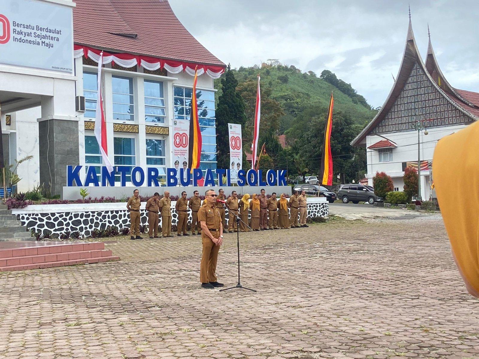 Arosuka, fokustkp.com- Pemerintah Kabupaten Solok melaksanakan apel pagi pada Senin 01 September 2025 di Halaman Kantor Bupati Solok, Arosuka. Apel pagi ini dipimpin oleh Sekwan Zaitul Ikhlas. Kegiatan ini juga diikuti oleh Sekretaris Daerah Medison, Para Staf Ahli, Para Asisten serta Kepala OPD dan seluruh Aparatur Sipil Negara (ASN) dan tenaga honorer di lingkungan Pemerintah Kabupaten Solok.