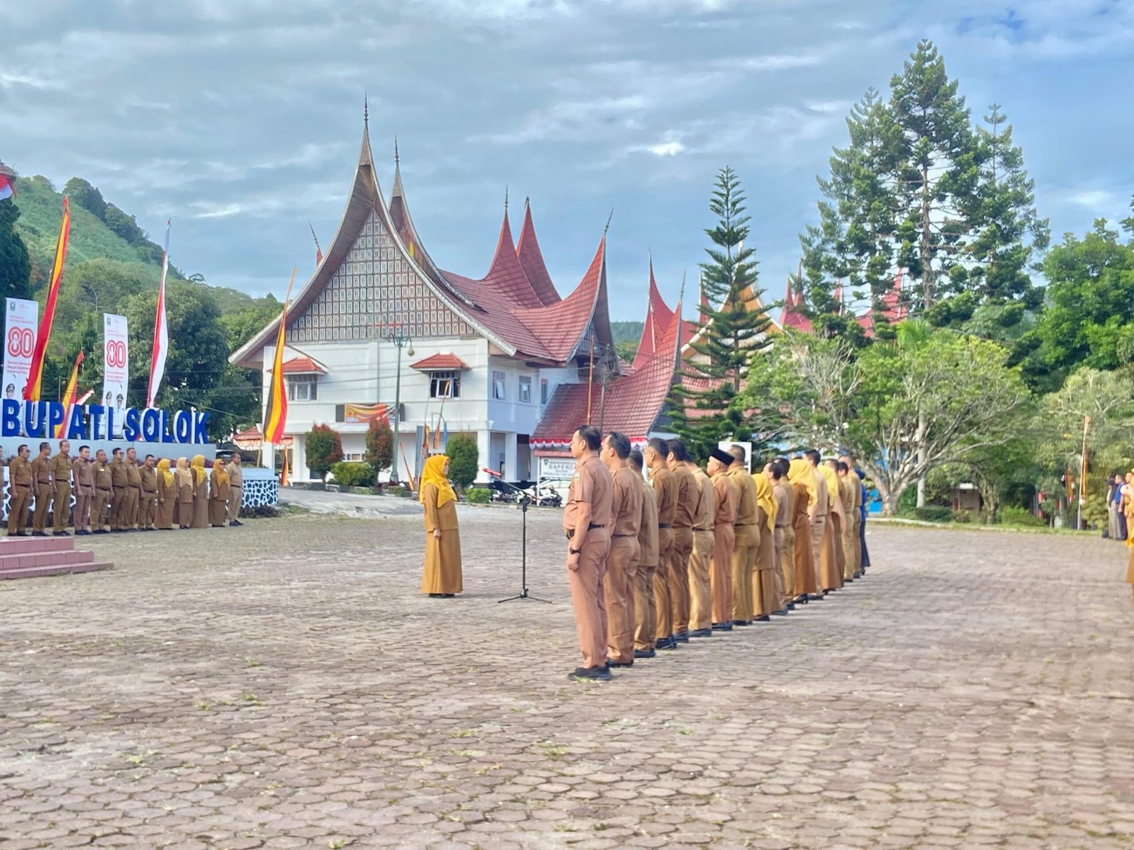 Arosuka, fokustkp.com- Pemerintah Kabupaten Solok melaksanakan apel pagi pada Senin, 25 Agustus 2025 di Halaman Kantor Bupati Solok, Arosuka. Apel pagi ini di pimpin oleh Kepala Dinas Komunikasi dan Informatika Teta Midra. Kegiatan ini juga diikuti oleh Sekretaris Daerah Medison, Para Staf Ahli, Para Asisten Bupati serta Kepala OPD dan seluruh Aparatur Sipil Negara (ASN) serta tenaga honorer di lingkungan Pemerintah Kabupaten Solok.