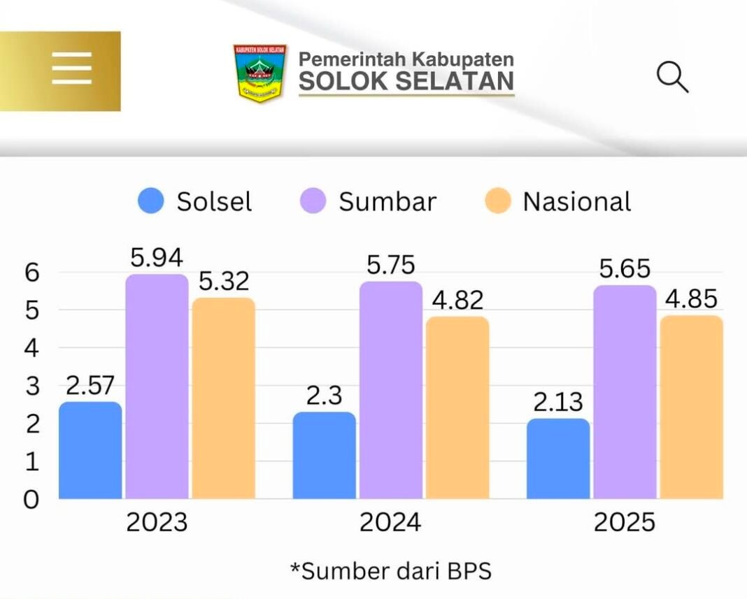 Padang Aro – Tingkat pengangguran terbuka di Kabupaten Solok Selatan terus mengalami penurunan. Menurut data BPS, selama tiga tahun terakhir terus turun dari posisi 2,57% di 2023, kemudian menjadi 2,30% di tahun 2024, dan angka terakhir pada tahun lalu sebesar 2,13%.